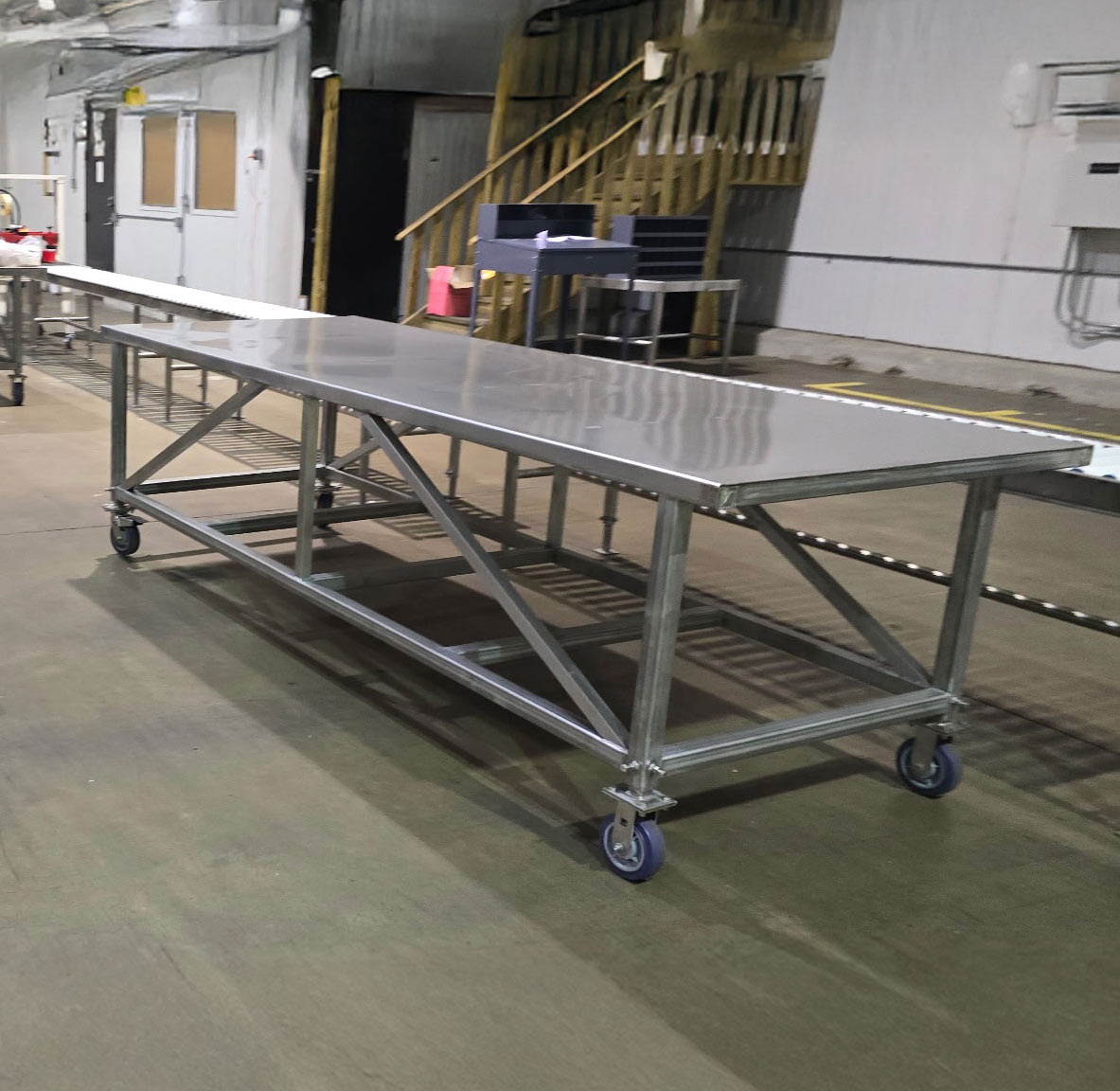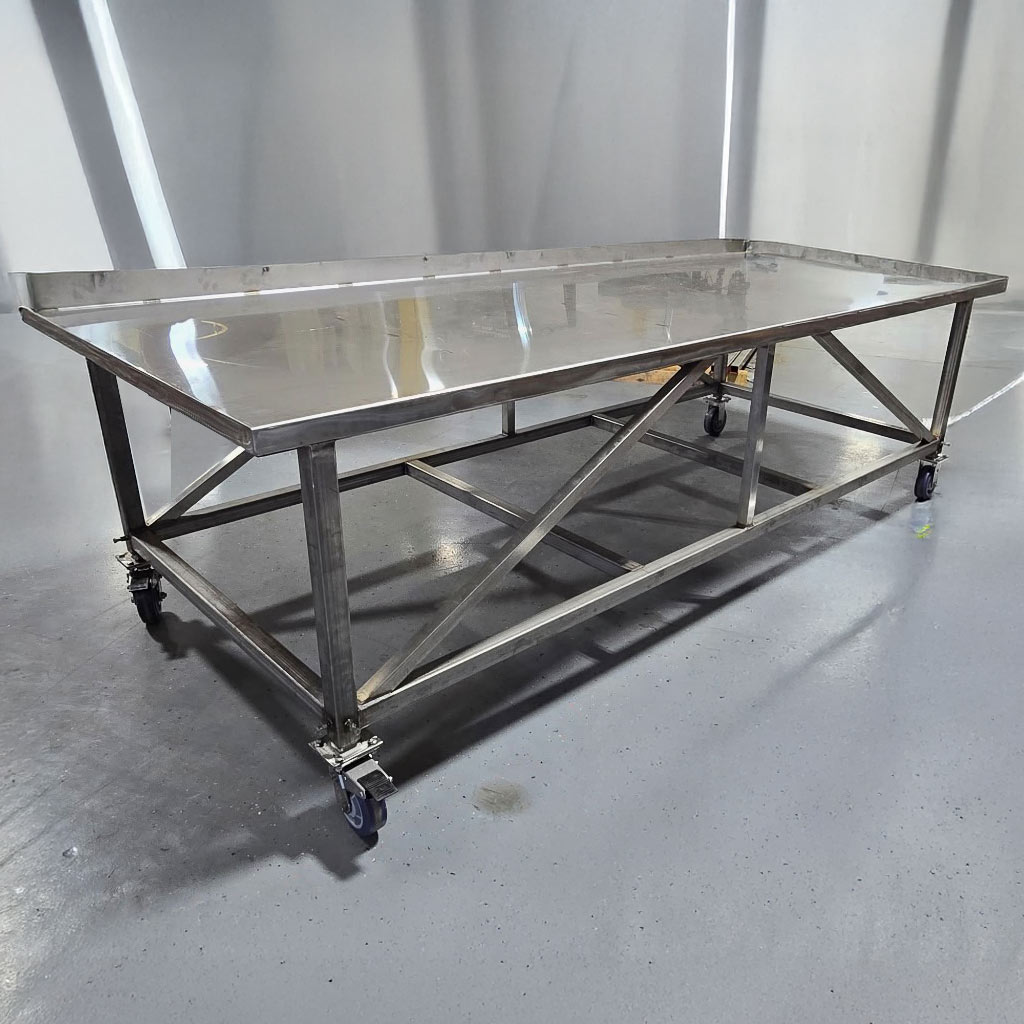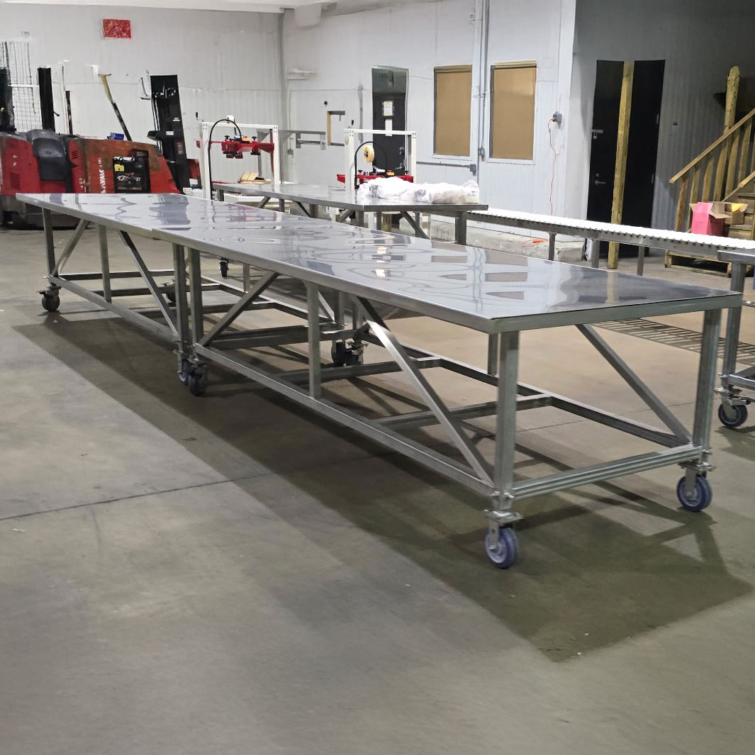 Table measurements are 4 ft. W x 10 ft.L x 36 in. – 42 in. adjustable H.